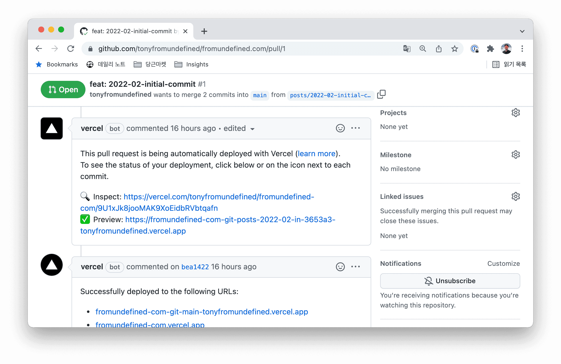 배포는 Vercel로 진행했습니다. 별다른 CI 설정도 필요 없이 클릭만 몇 번 하면 빌드부터 배포까지 완료되고, PR을 생성하면 자동으로 Preview 링크도 댓글로 달아줍니다. Gatsby 환경에서 빌드 캐시도 잘 잡아줘서 빌드부터 배포까지 30-40초 내외로 굉장히 빠르네요.