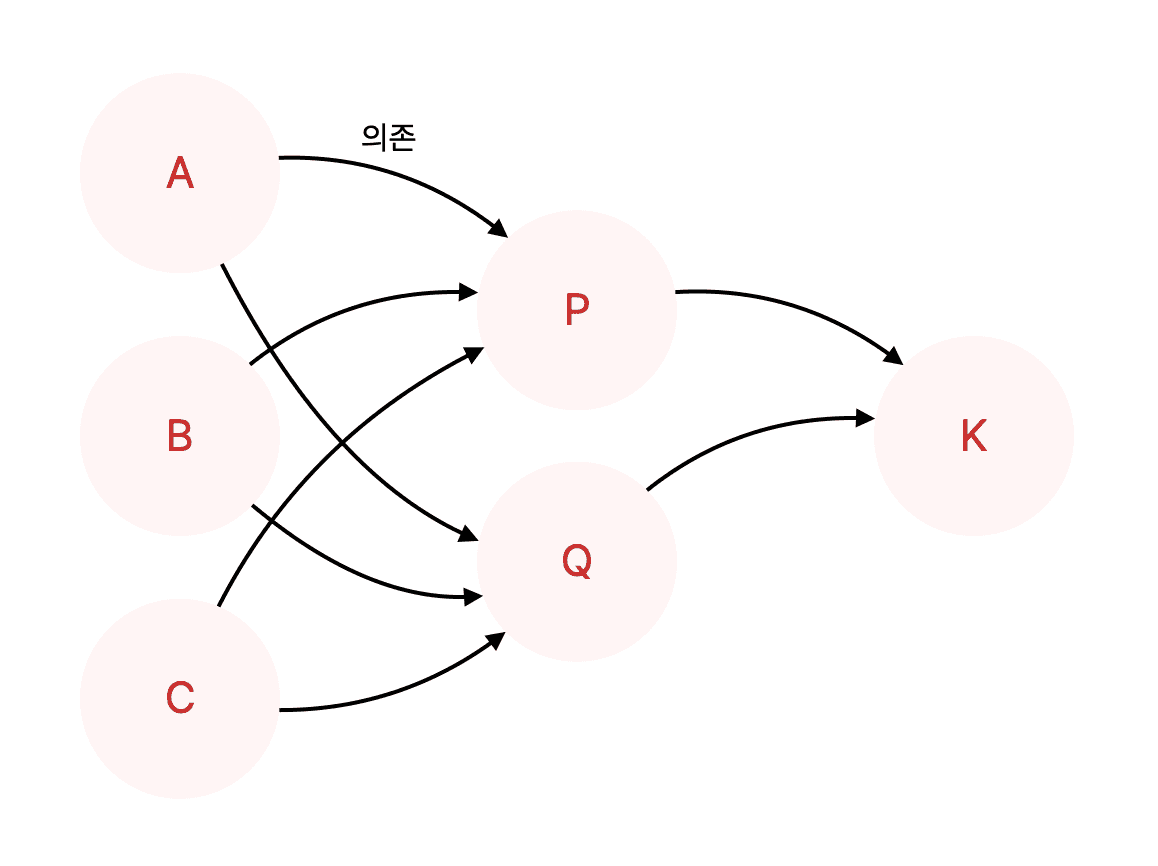 - P라는 라이브러리가 수정되면, K, Q를 제외한 P, A, B, C 프로젝트가 순서대로 빌드되어야 합니다.