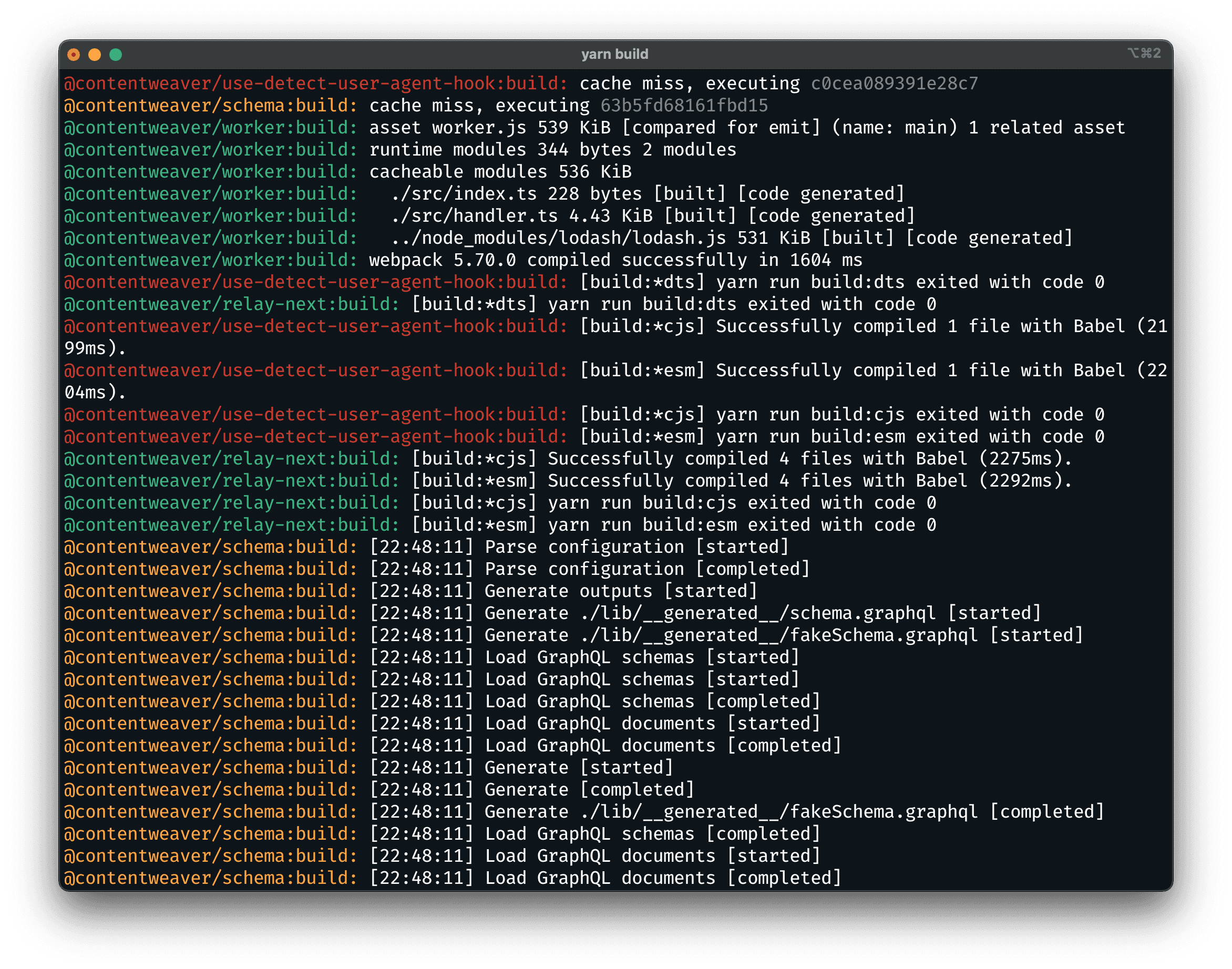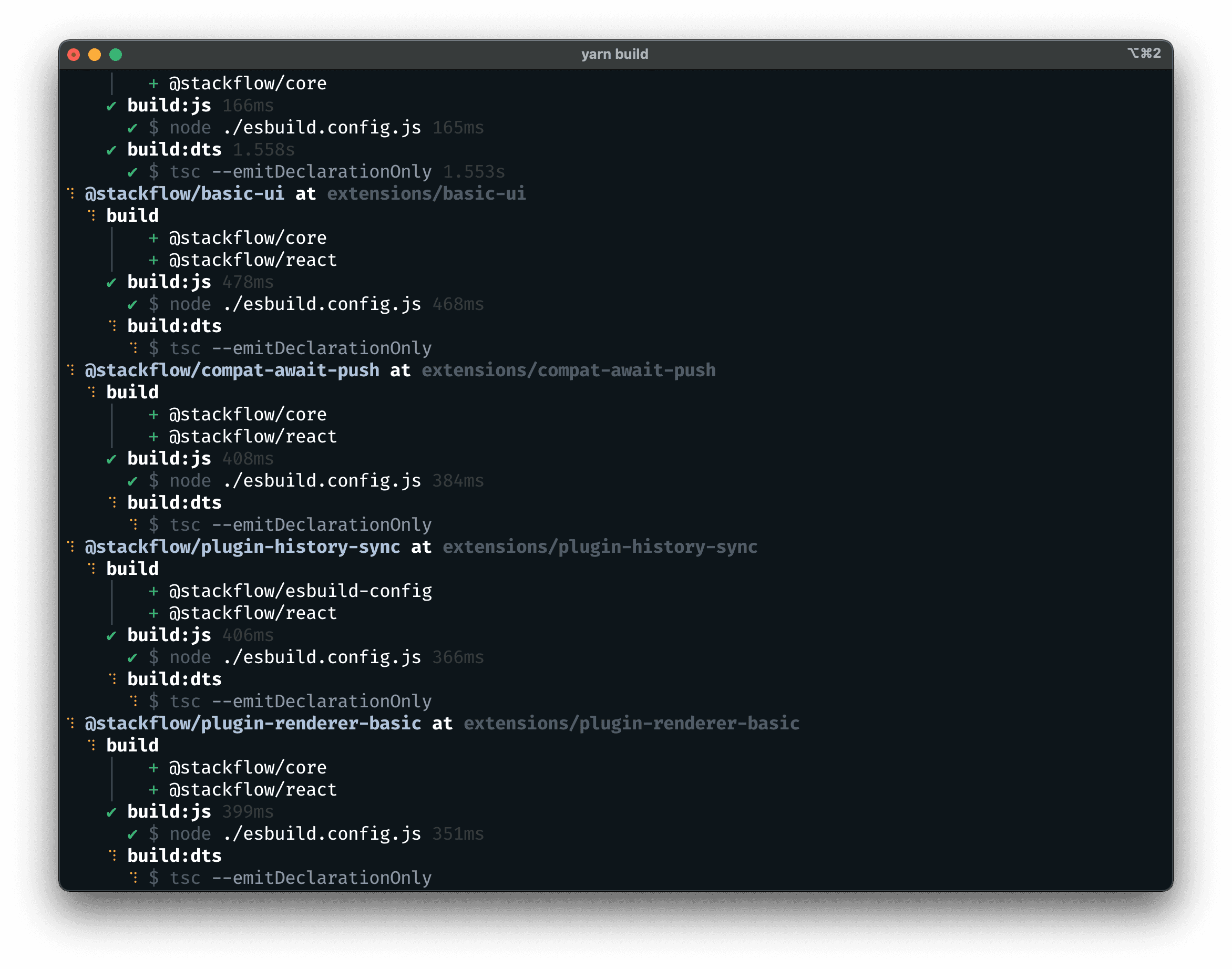 $ yarn workspace foreach -t build하지만, 플러그인으로 제공되는 확장 기능인 만큼 특정 패키지에 의존하고 있는 패키지들만 빌드한다든지, 빌드 결과를 캐싱한다든지 하는 더 강력한 기능은 아쉽게도 더 지원되지 않습니다. 또한 마찬가지로 JavaScript(Node.js)로 만들어진 도구이기 때문에 병렬로 다양한 스크립트를 수행하는데 오버헤드가 뒤따릅니다.