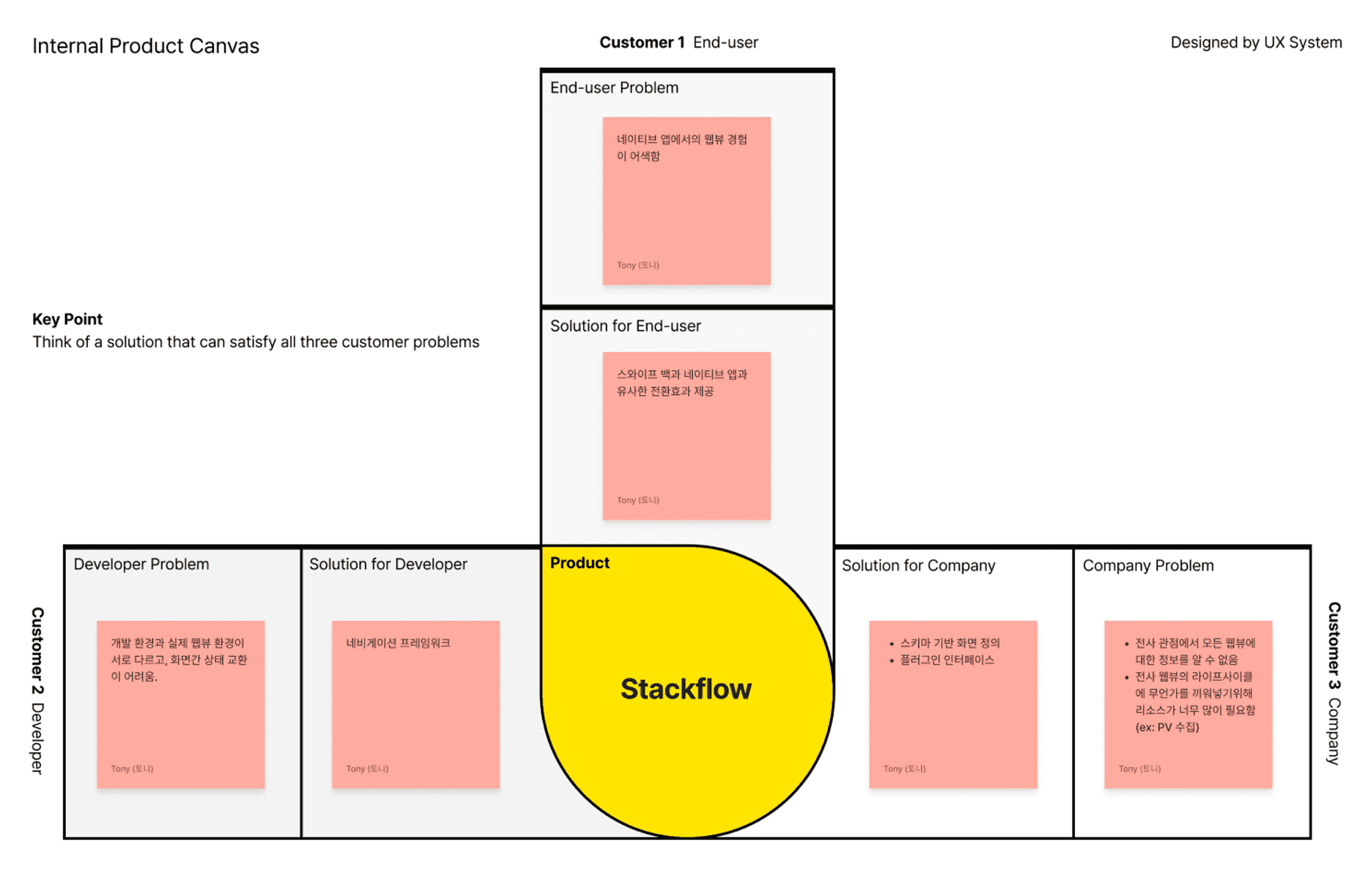 (예시) 아래는 당근 프론트엔드코어 팀에서 만들고 있는 Stackflow가 해결하는 문제들을 Internal Product Canvas에 그려본 결과입니다.